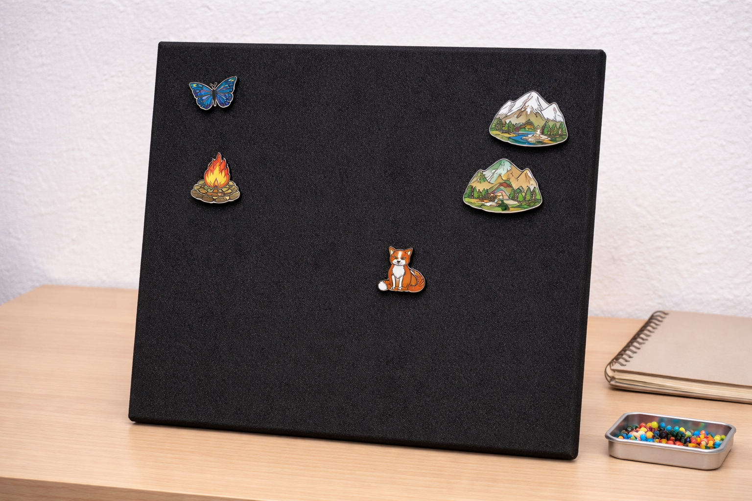 Most enamel pin collections start with a simple foam board. While it holds your pins, it doesn’t add to the display. The background is plain and the holes show through.
