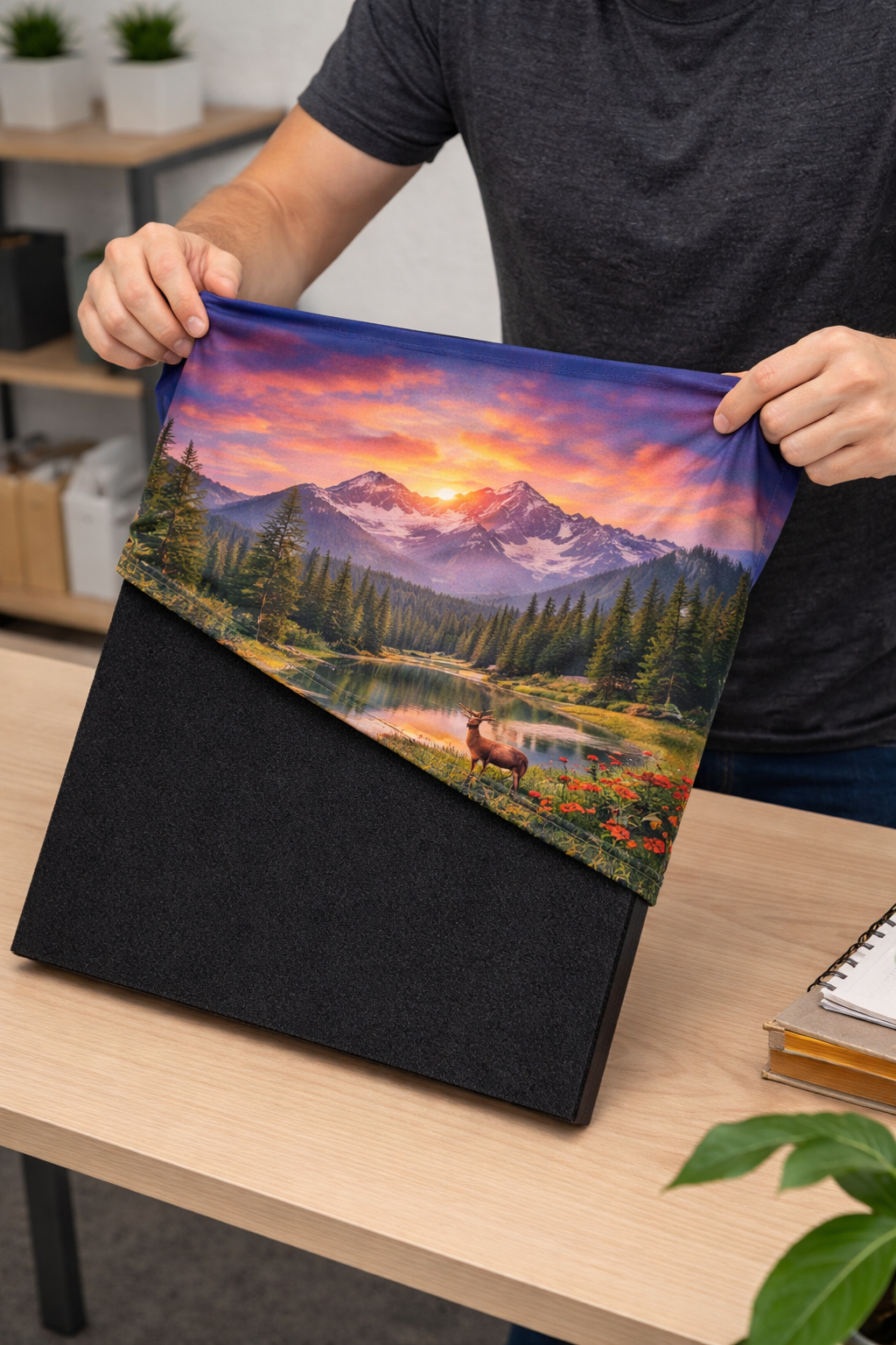 Double-sided stretch fabric covers that transform foam pin boards into immersive themed displays.