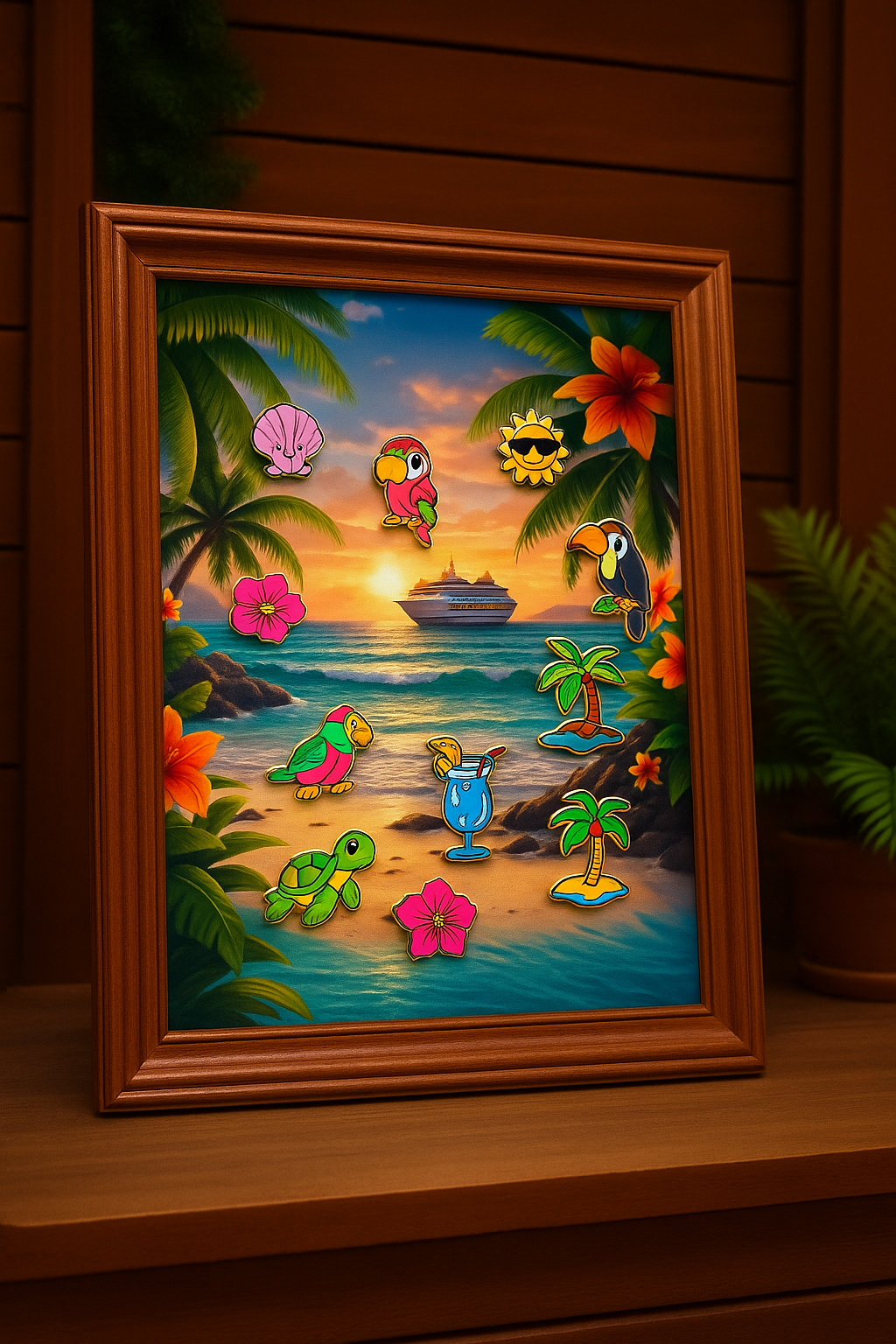 Warm skies, swaying palm trees, tropical flowers, and a cruise ship drifting across aqua waves create the perfect setting for beach-themed, cruise-themed, or summer-themed pin collections.